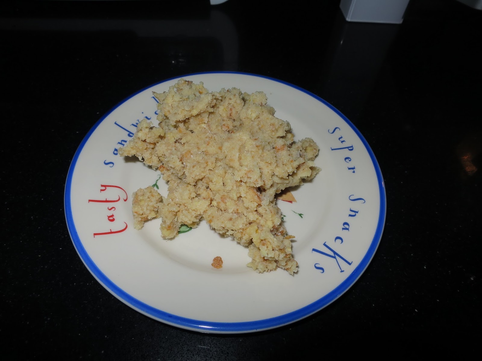 Fica numa consistência de uma pasta, tempero com pimenta preta e sal. Pouco, pois o parmesão já dá um sabor. E coloco em cima dos ¨montinhos¨ de bacalhau.