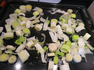 Entretanto faço uns legumes assados no forno, como tinha em casa alho francês simplesmente cortei, coloquei azeite, sal e pimenta e assei no forno, até ficarem tenros.Imagino que se tivesse tomate, courgette também poria...