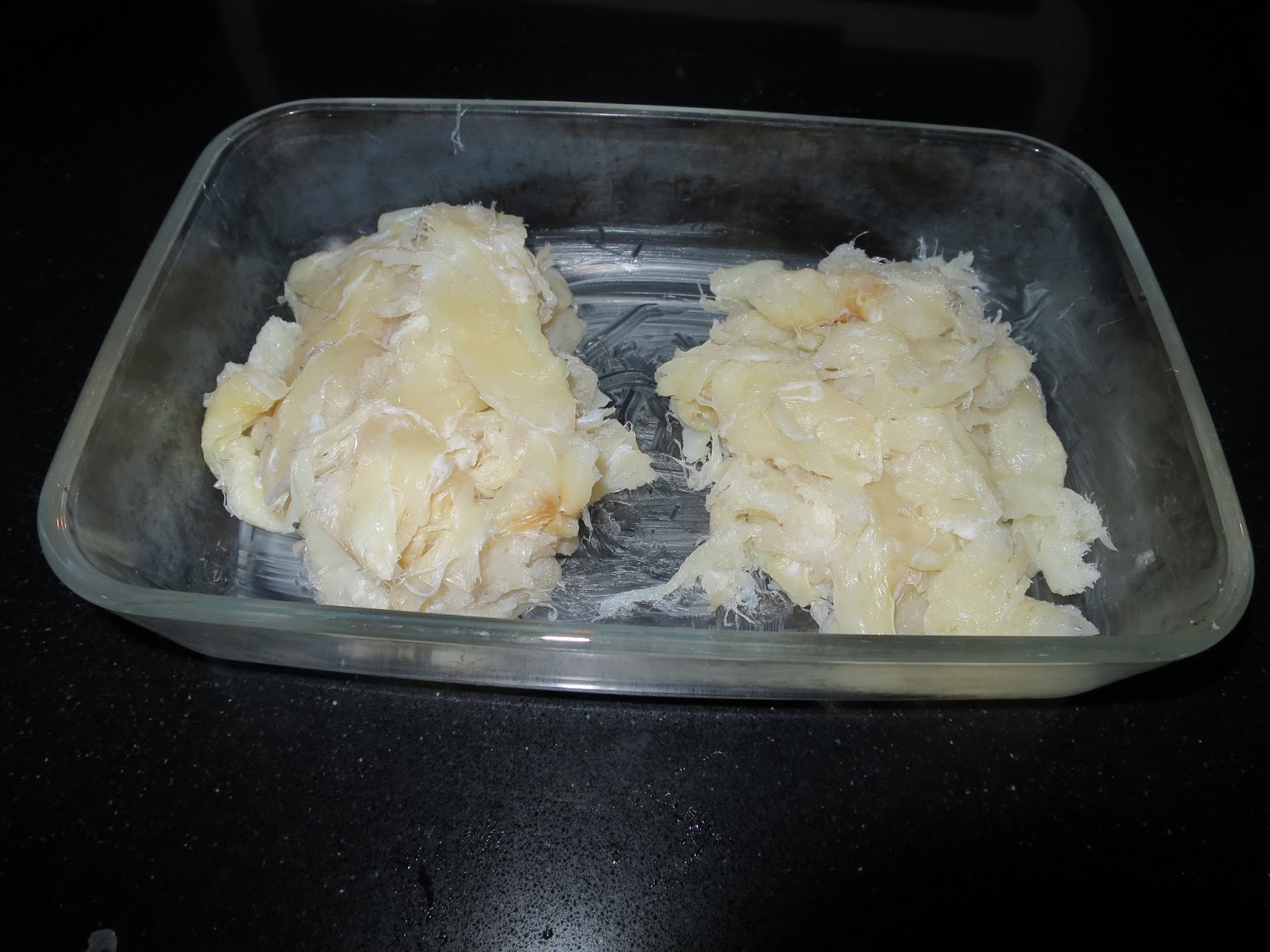 Depois de descongelar, desfio toda a posta, tiro a pele e as espinhas, divido em duas partes e faço dois ¨montinhos¨, como dois hambúrguers altos. coloco num refractário untado com manteiga.