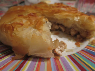 Levamos ao forno para assar, quando a parte de cima fica dourada, com muito cuidado tiramos do forno, colocamos um prato e viramos a tarte do lado contrário, e voltamos a pôr no refratário, mas desta vez, com a parte de baixo virada para cima, pois a massa filo tem que estar bem assada para ficar na sua potência "crunch".
