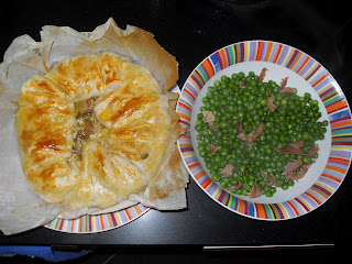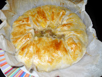 Entretanto abrir a massa folhada, colocá-la em uma forma redonda e fazer o empadão, recheando a massa folhada com o preparado já frio. Pincelar a massa com a gema de ovo.