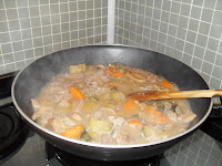 Fazer um refogado com o azeite e cebola, aos poucos colocar o alho.Depois colocar 2 colheres de manteiga, a cenoura, o aipo, os champignons e a carne, deixar fritar por uns 5 minutos.