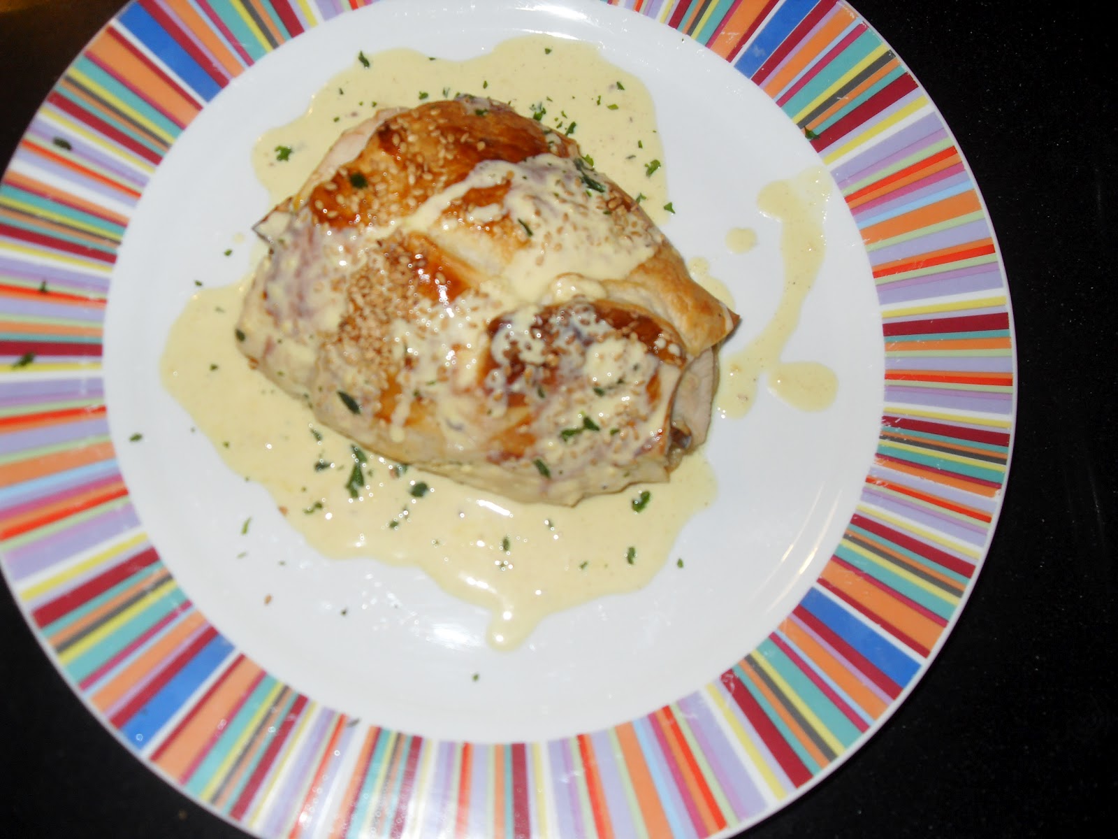 Daí dividimos a placa de massa folhada em 4 fatias e envolvemos ( bonito dizer ¨envolvemos¨,né?), cada peitinho rechado com massa folhada, pincelamos com a gema e salpicamos com o gergelim: