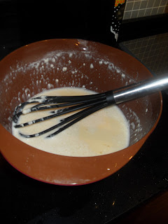 Batemos todos os ingredientes da massa da torta, e fica assim, mesmo bastante líquido. Depois de estar bem misturadinho é só escorrer para o refratário com as linguiças...