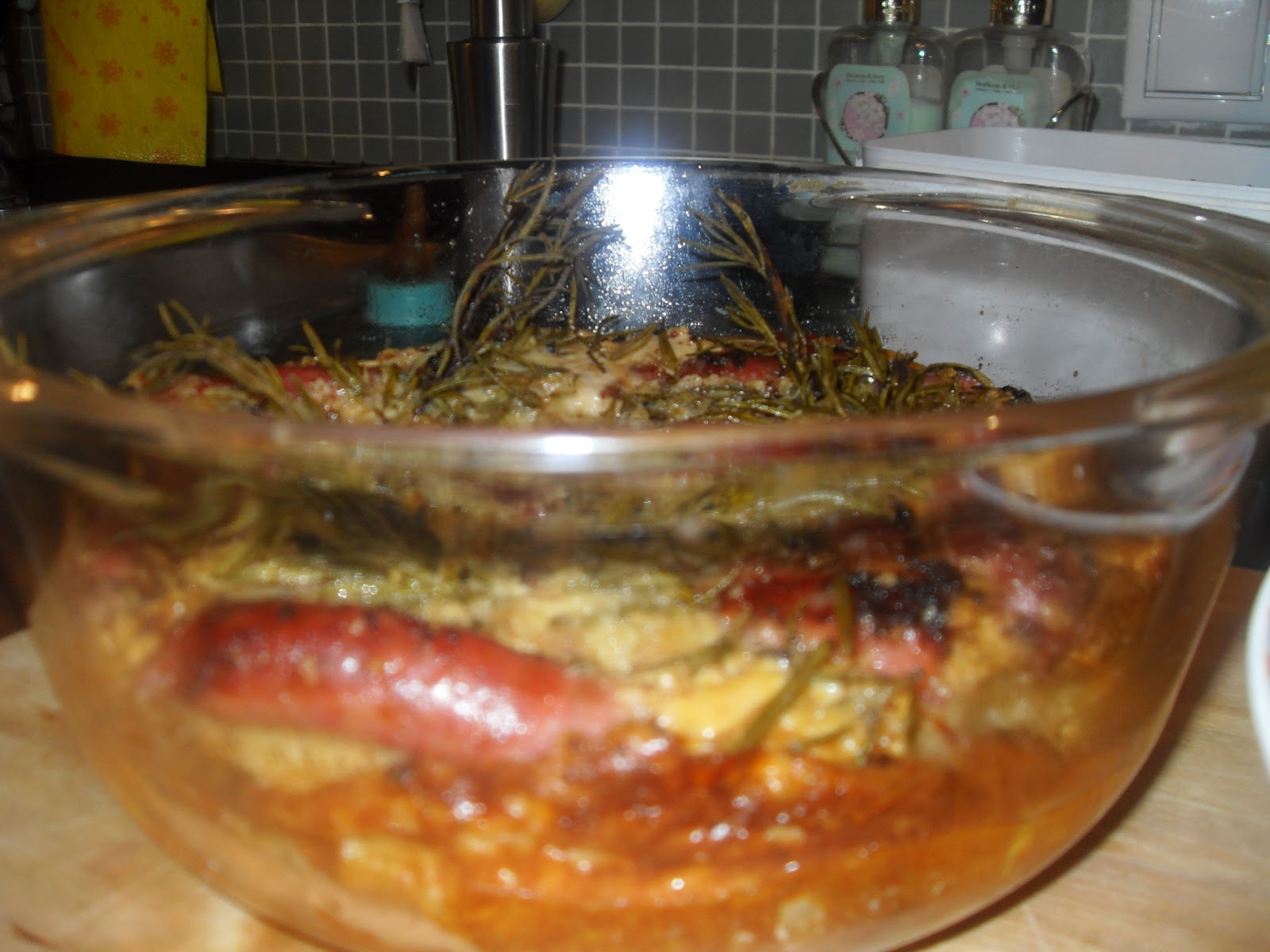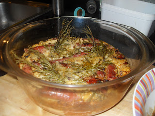 Depois de ter misturado a massa da torta com as linguiça colocamos o alecrim e já está pronto, é só levar ao forno por meia hora...