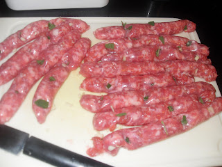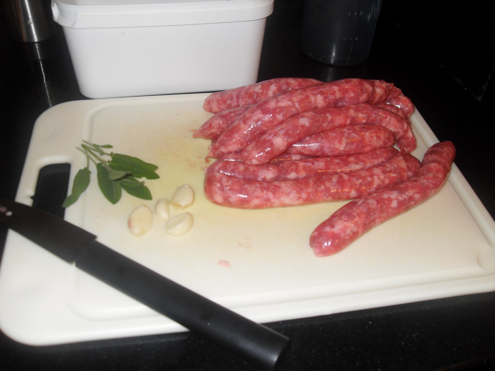 Fazemos um pequenos furinhos nas linguiças e cortamos o alho e a sálvia em pedaços pequeninos.