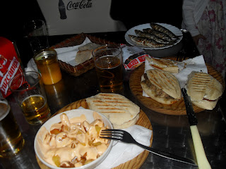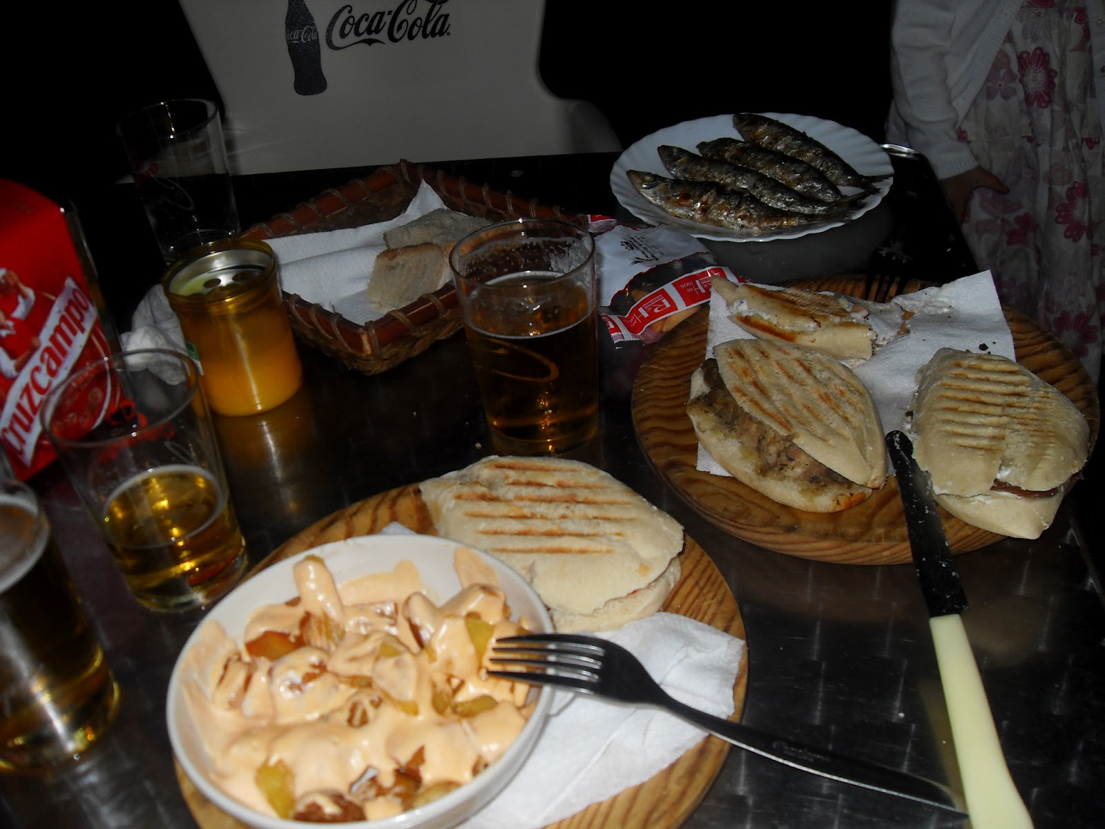| Sanduíche de anchovas, presunto e lombo. Batatas bravas e sardinhas assadas. |